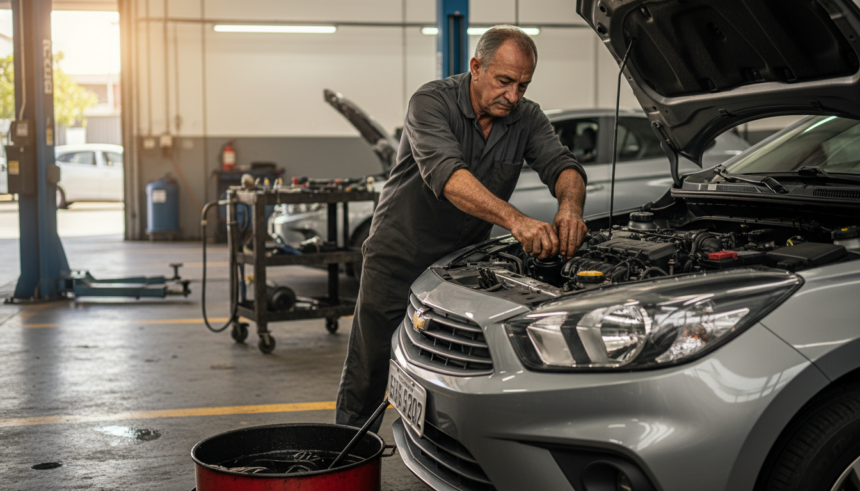 Mecânico realizando troca de óleo em carro popular brasileiro em oficina.