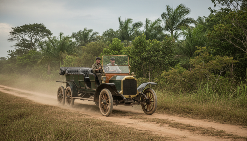 Reeves Overland Octoauto de 1911 com oito rodas em uma estrada de terra brasileira